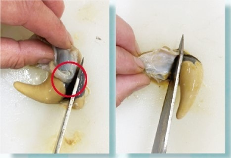 ⑤肝の〇の部分に砂が入っていることがあるので包丁で切り落とし、ヒモの部分も切り分けてよく洗う