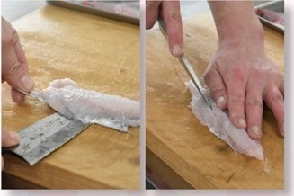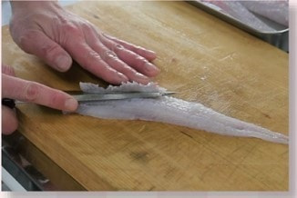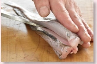 ⑤尻尾側の方から包丁を入れて皮を引き、血合い骨を切り取る