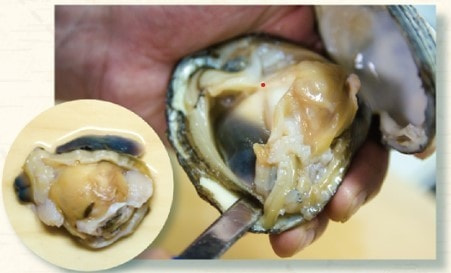 ②殻を開き薄膜の後ろにある四隅の貝柱をナイフで切り、身を丸ごと引き出す