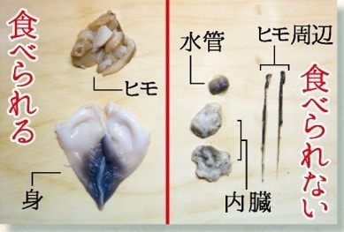 | ② ホッキは水管とヒモと切り取った後、開いて内臓(はらわた)を取り除き塩水で洗い細長く切る |