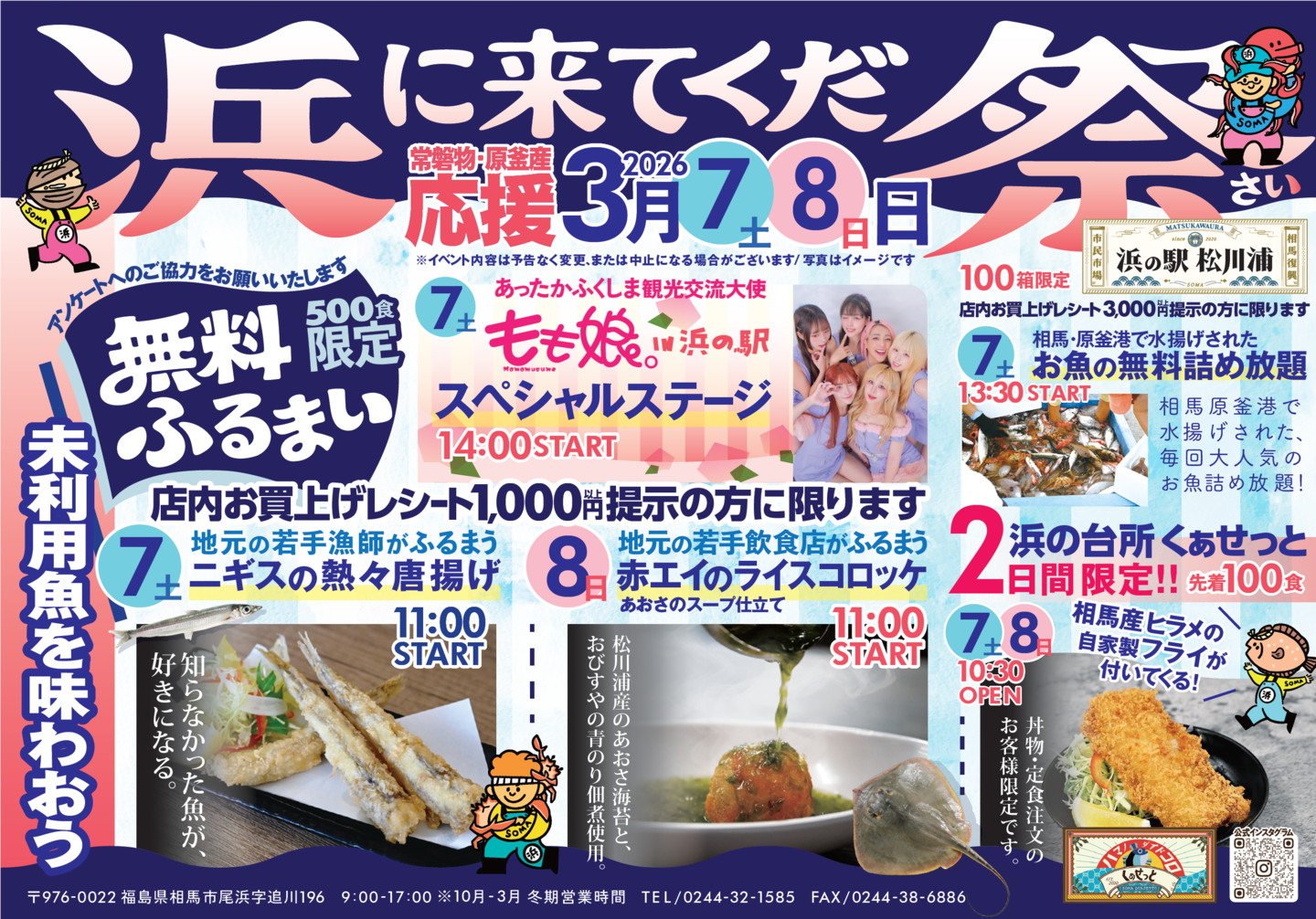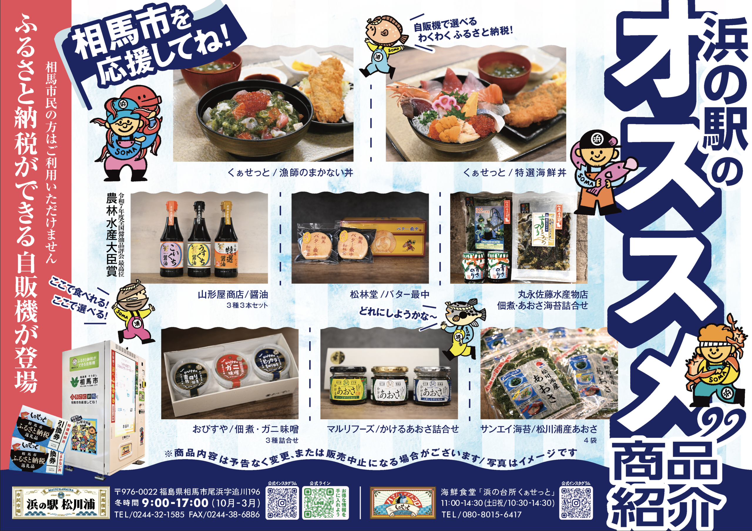 食事だけでなく、おやつも酒のつまみも、美味しかったら誰もが笑顔になりますもんね。浜の駅松川浦は食堂『くぁせっと』のメニューのみならず、今晩のおかずのネタや酒の肴、深夜のおやつに至るまで美味しいものが勢揃い。美味しいものをたくさん食べて、毎日笑顔で過ごしましょう!