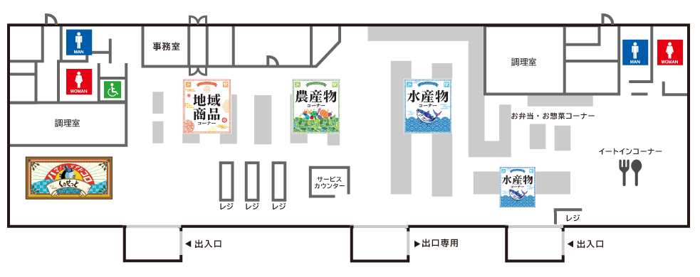 営業時間 | 売場 9:00~18:00(夏期:4月~9月) 9:00~17:00(冬期:10月~3月) 食堂 平 日 11:00~14:30(食券販売終了) 土日祝 10:30~14:30(食券販売終了) |