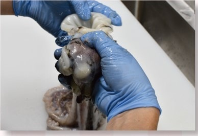 ①タコの頭をめくり、中の内臓を手で引っ張ってすべて取り除き、頭の中や吸盤の汚れを綺麗に洗い流す。袋に入れて冷蔵庫で一晩凍らせる