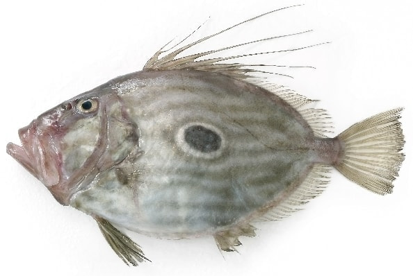 側面から見ると楕円形で中央に大きな黒斑があり、この斑点が「的」のようなことからマトウダイとの名がついた。大きさは約30cm。入荷は少ないためやや高値。