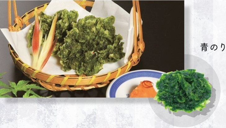 ④ 青海苔に衣を入れて、ヘラに薄くのせ、熱した揚げ油の中に流し込むように入れてサッと揚げる |