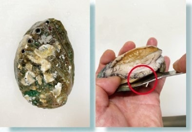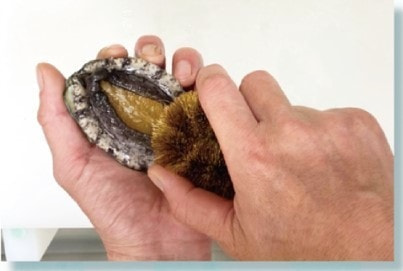 ①アワビの身の部分を上にして、たわしで擦りヌメリと汚れを落とす