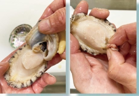 ④貝柱の周りにあるヒモと肝(勾玉形の部分)を指で引き剥がし、身の方についている口(赤い部分)を指で摘まんで取り除く
