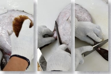 ①タワシで体表のヌメリを落とし、左右のヒレと尾ヒレを切り落とす