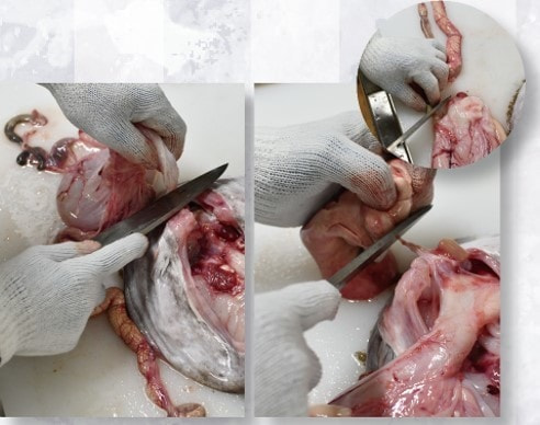 ②内臓が傷つかないように肛門から腹ビレにかけて包丁を入れ、腹を開き、胃袋、肝、卵巣を取り出す(胃袋と卵巣を切り離す)