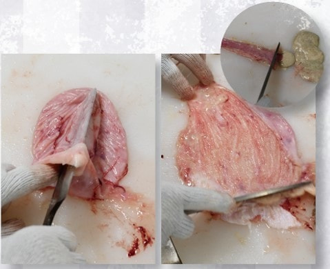 ③胃袋を切り開き、包丁で内側のヌメリを取り除く。卵巣も包丁で中身を取り除く
