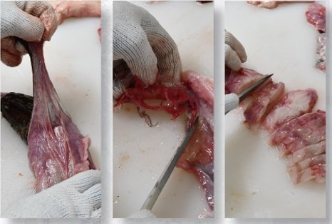 ⑤身と頭の皮を剥ぎ、下あごのエラを切り取る。それぞれをお好みの大きさにブツ切りにして完成