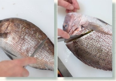 ②内臓を取り除き、血合いに切り込みを入れ、よく洗う