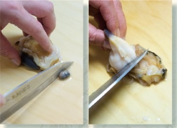 ②殻を開き薄膜の後ろにある四隅の貝柱をナイフで切り、身を丸ごと引き出す