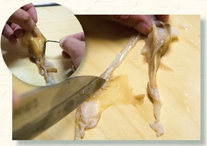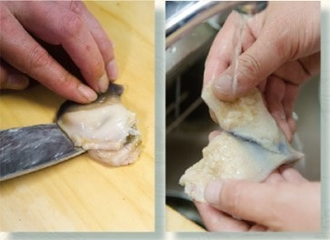 | ② ホッキは水管とヒモと切り取った後、開いて内臓(はらわた)を取り除き塩水で洗い細長く切る |